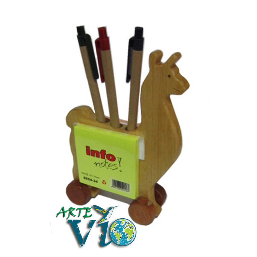 Sencilla y elegante a la vez. Esta pieza realizada en madera, muestra una llamita portando a modo de traje un porta notas coloridas, añadiendo una cuota de compañía en el ambiente del usuario final.